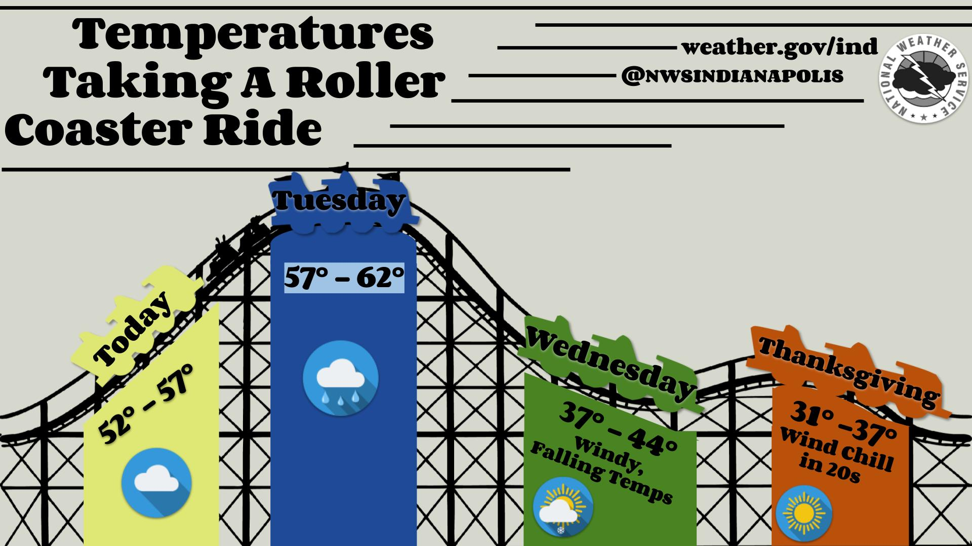 | As is expected for Indiana this time of year, multiple seasons will occur in just one week. Autumnal highs in the 50s expected through Tuesday, then a strong cold front ushers in winter dropping temperatures into the 20s and 30s just in time for Thanksgiving. #inwx |